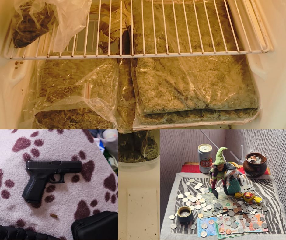 En el lugar se incautaron un arma de fuego tipo pistola, cartuchos, dinero en efectivo, terminales móviles, sustancias sujetas a fiscalización, adhesivos con logotipos de “lobos”, un altar a un duende, una figura que la utilizan supuestamente para tener protección ante las cosas que realizan.