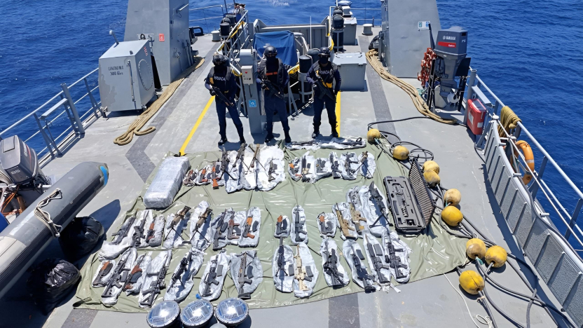 Una operación de la Armada del Ecuador desmanteló una red marítima que transportaba armas de alto calibre en aguas del Pacífico, cerca de las Islas Galápagos. El operativo dejó 52 detenidos y el decomiso de un arsenal que incluía ametralladoras Barrett, fusiles AK-47 y rifles Colt M4, además de más de 2.300 galones de combustible no declarado.