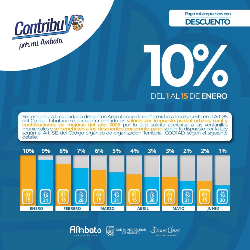 El Municipio de Ambato recuerda a los contribuyentes que, al cumplir con sus obligaciones desde los primeros días de enero, pueden acceder a las rebajas y exoneraciones progresivas que establece la ley (descuentos por pronto pago que inician con el 10% en la primera quincena de enero).