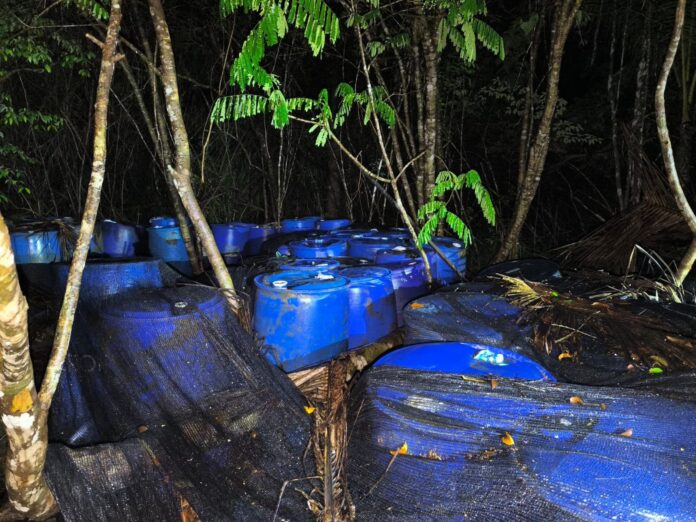 Entre los indicios encontrados constan un semisumergible, cerca de 6.000 galones de combustible, seis lanchas de fibra de vidrio, siete motores fuera de borda, 25 tanques con diésel, 120 tanques vacíos, equipos de navegación y un arma de fuego tipo escopeta.
