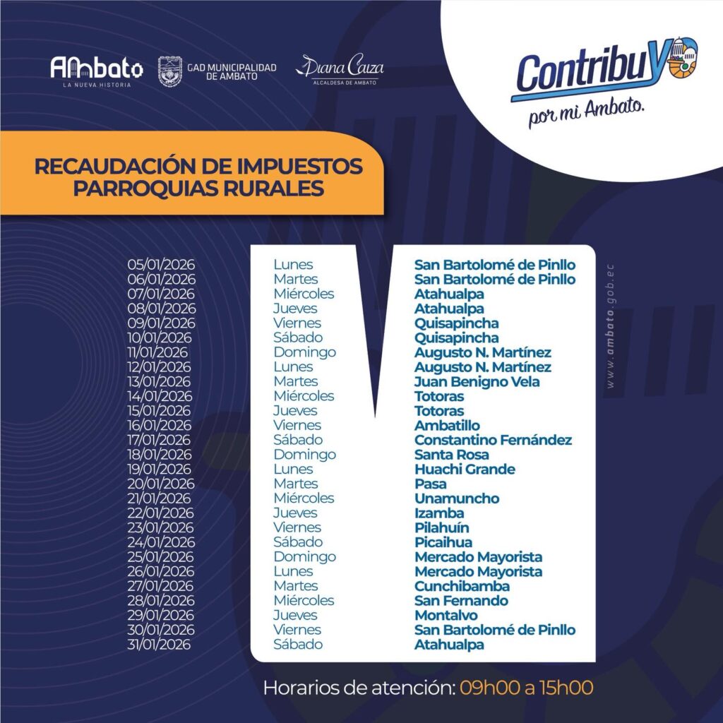 Como parte del fortalecimiento del servicio, desde el martes 6 de enero se activó la unidad móvil de recaudación, que inició su recorrido en la parroquia San Bartolomé de Pinllo, facilitando el pago del predial y la contribución especial de mejoras en sectores rurales. La Municipalidad de Ambato informó que esta modalidad continuará durante enero en las 18 parroquias rurales, junto con nuevos puntos fijos y horarios extendidos, incentivando el pronto pago que se traduce en obras y bienestar para la ciudad.