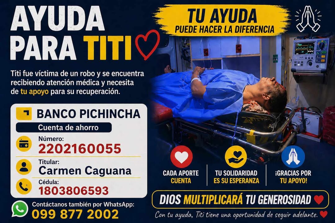 Una campaña solidaria se activa en Ambato para apoyar a Patricio Túqueres, popularmente conocido como ‘Titi’ quien resultó gravemente herido tras un violento asalto y actualmente permanece bajo atención médica. Familiares y allegados solicitan ayuda económica para cubrir los gastos de su recuperación.